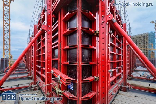 Для высотных проектов, например, для строительства лифтовых шахт небоскрёбов (любых зданий выше 30 этажей), ГК «ПромСтройКонтракт» рекомендует использовать самоподъёмную опалубку , которую можно арендовать на выгодных условиях. Гидравлическая система позволяет делать необходимые технологические паузы, чтобы синхронизировать скорость работ по возведению разных частей здания.